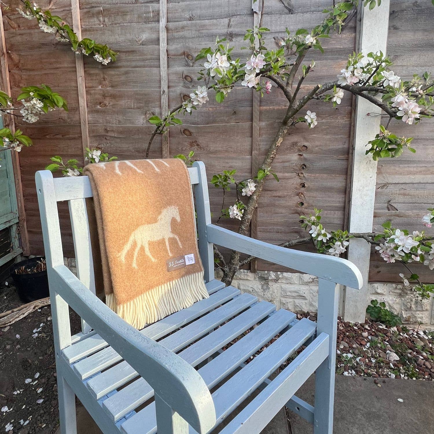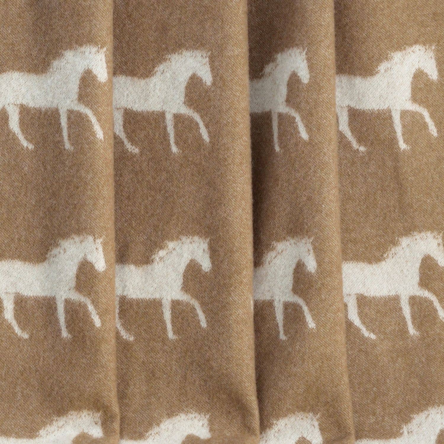 Gallop home to envelop yourself with this warming and luxurious throw. Woven from 100% wool and featuring a unique horse design, this throw is made to be the stand-out accessory of your home. Made from 100% pure wool, the natural insulating abilities make this blanket the perfect cosy layer all year round. It is fully reversible, featuring an elegant colour scheme which is inverted on the reverse side, in effect giving you two throws in one. With its fringed-edge and unique design, this statement piece will add some unique character and a touch of calming serenity to your interior.
