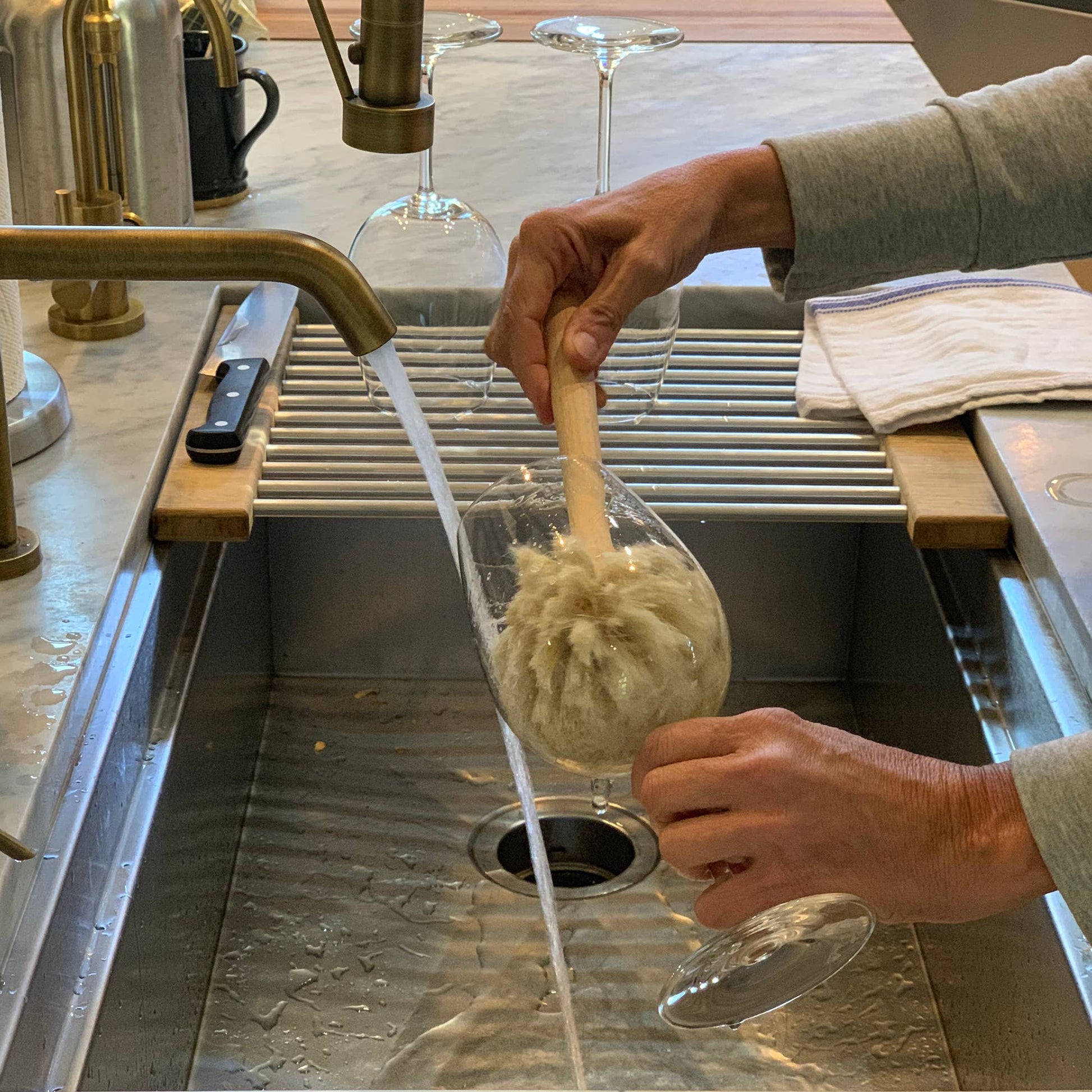 This scrubber is constructed out of sturdy beechwood with 100% natural horsehair bristles. Soft horse hair ensures a gentle scrub, making it an excellent choice to clean almost anything in your kitchen. Ideal for delicate glassware and stemware, handmade glasses, french coffee presses, Chemex pour over, and champagne glasses. The convenient bulb head allows for cleaning in all directions.
