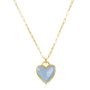 This elegant necklace features a heart-shaped pendant crafted from natural stone, enclosed within a frame. The pendant is suspended from a 14k gold-filled paperclip chain that can be adjusted to a length ranging from 16 to 18 inches, allowing for a personalized and comfortable fit.